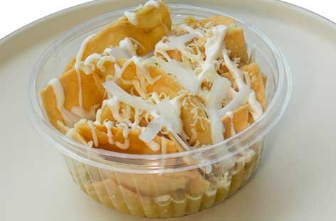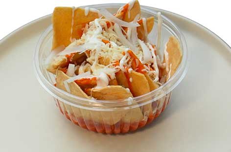 Totopos de maíz con una deliciosa salsa verde casera como topping, queso chihuahua, crema y cebolla.